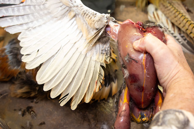 How do you butcher a small bird? Put your fingers back in after the initial. Reach forward and touch the heart with two fingers inserted all the way into the chest cavity.